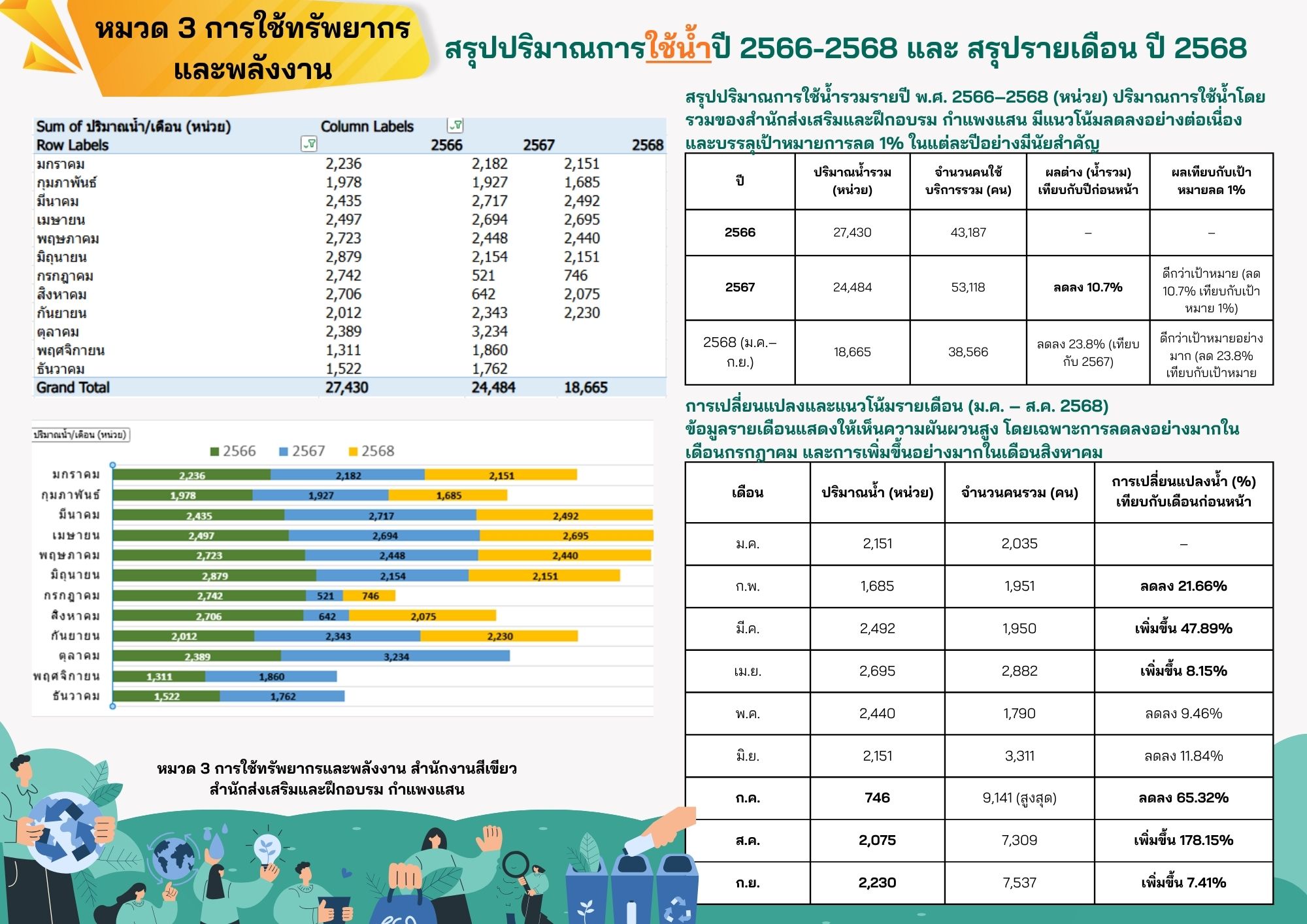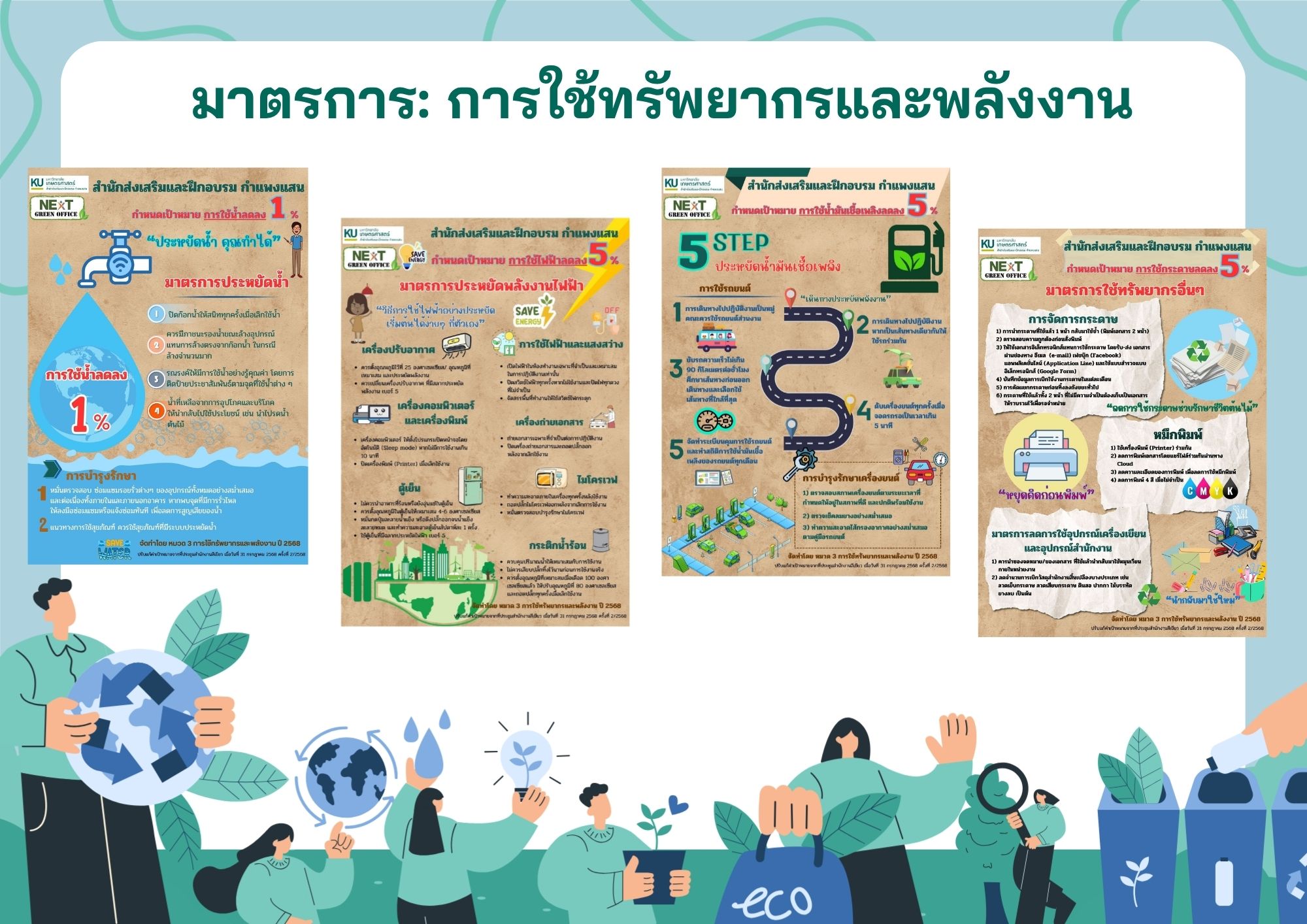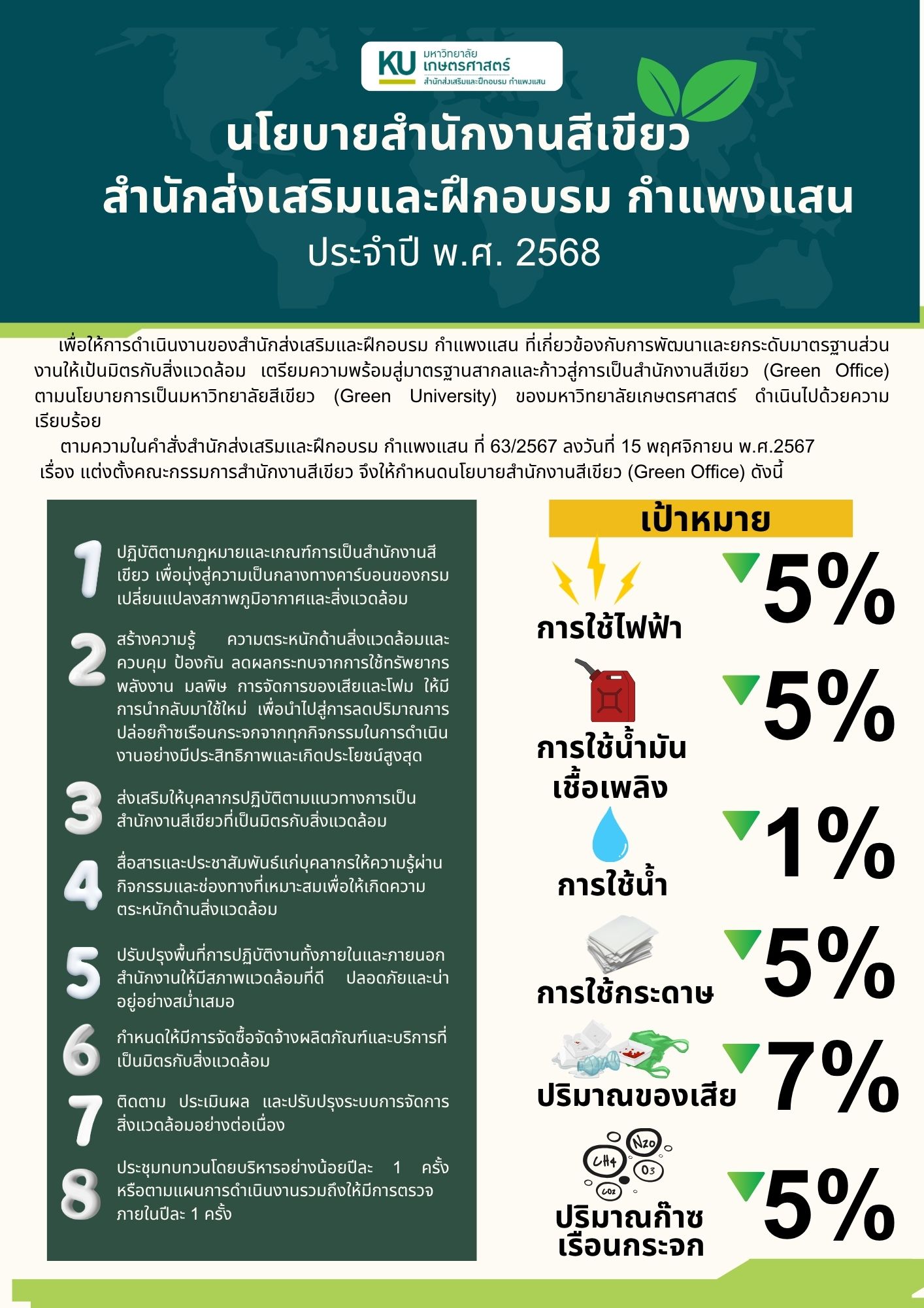 สำนักส่งเสริมและฝึกอบรม กำแพงแสน มีเป้าหมายในการดำเนินงานการเป็นสำนักงานสีเขียว (Green Office) ตามนโยบายมหาวิทยาลัยสีเขียว (Green University) ของมหาวิทยาลัยเกษตรศาสตร์ จึงมีการจัดทำมาตรการสำนักงานสีเขียวของหน่วยงานและขอความร่วมมือบุคลากรร่วมกันประหยัดพลังงานและทรัพยากร โดยถือเป็นหน้าที่หนึ่งในการปฏิบัติงาน