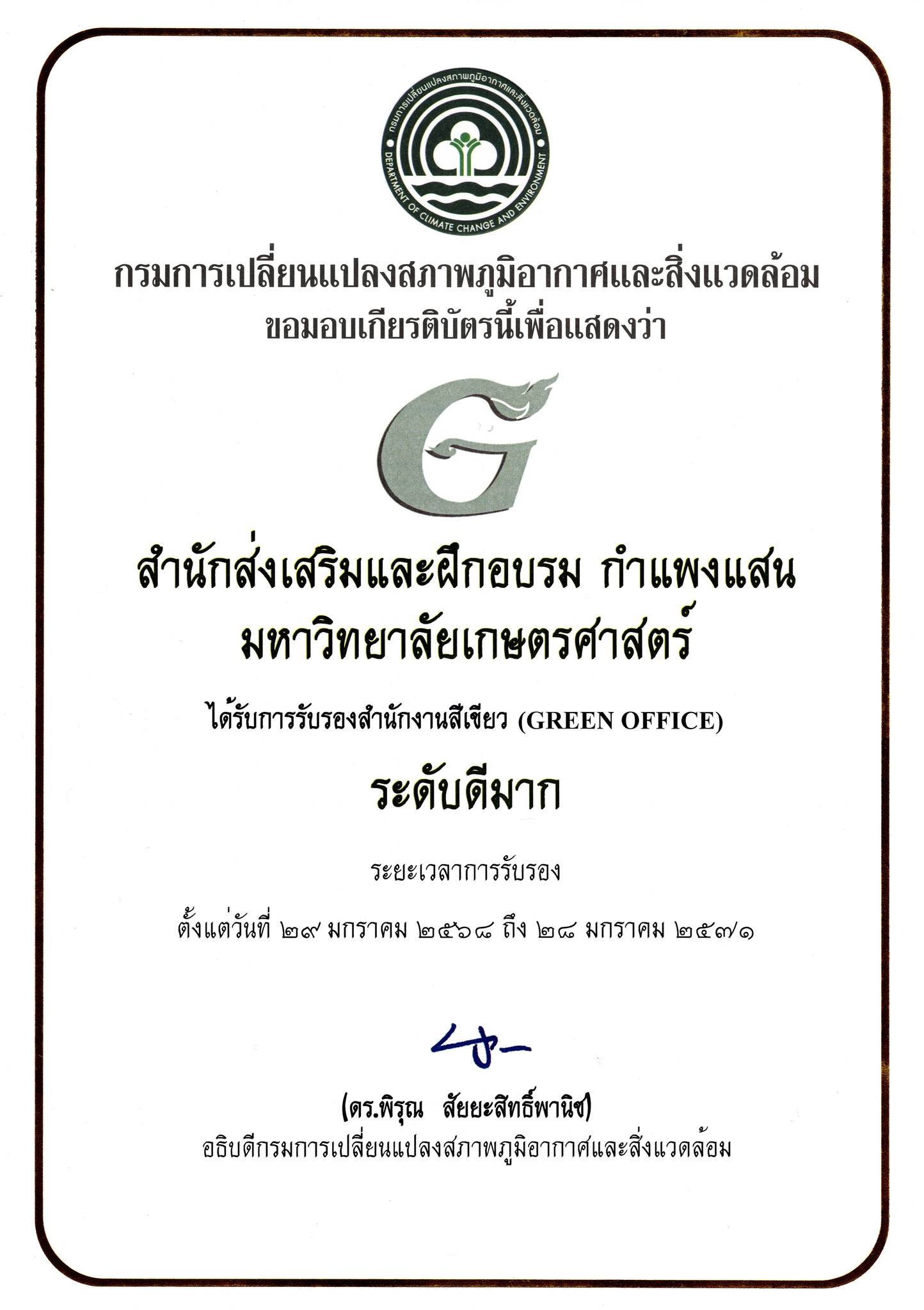 สำนักส่งเสริมและฝึกอบรม กำแพงแสน ได้รับการรับรองสำนักงานสีเขียว (GREEN OFFICE) ในระดับดีมาก โดยการรับรองจากกรมการเปลี่ยนแปลงสภาพภูมิอากาศและสิ่งแวดล้อม
