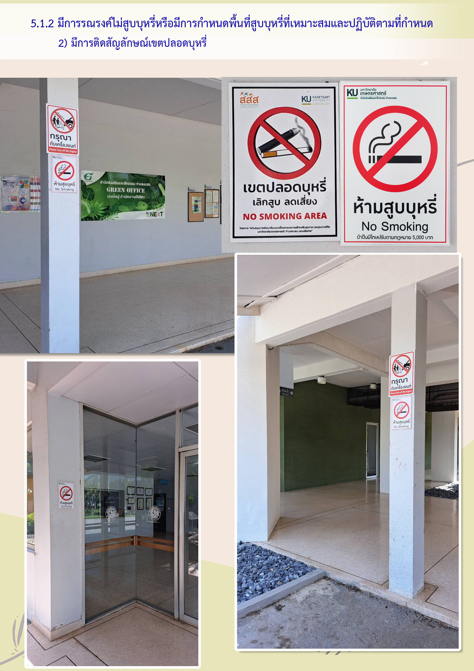 (5) ไม่พบการสูบบุหรี่ หรือก้นบุหรี่นอกเขตสูบบุหรี่(กรณีหน่วยงานเป็นสถานที่ห้ามสูบบุหรี่ไม่ต้องดำเนินการข้อ (3) – (4) และจะต้องไม่พบการสูบบุหรี่ หรือก้นบุหรี่ตามข้อ (5))