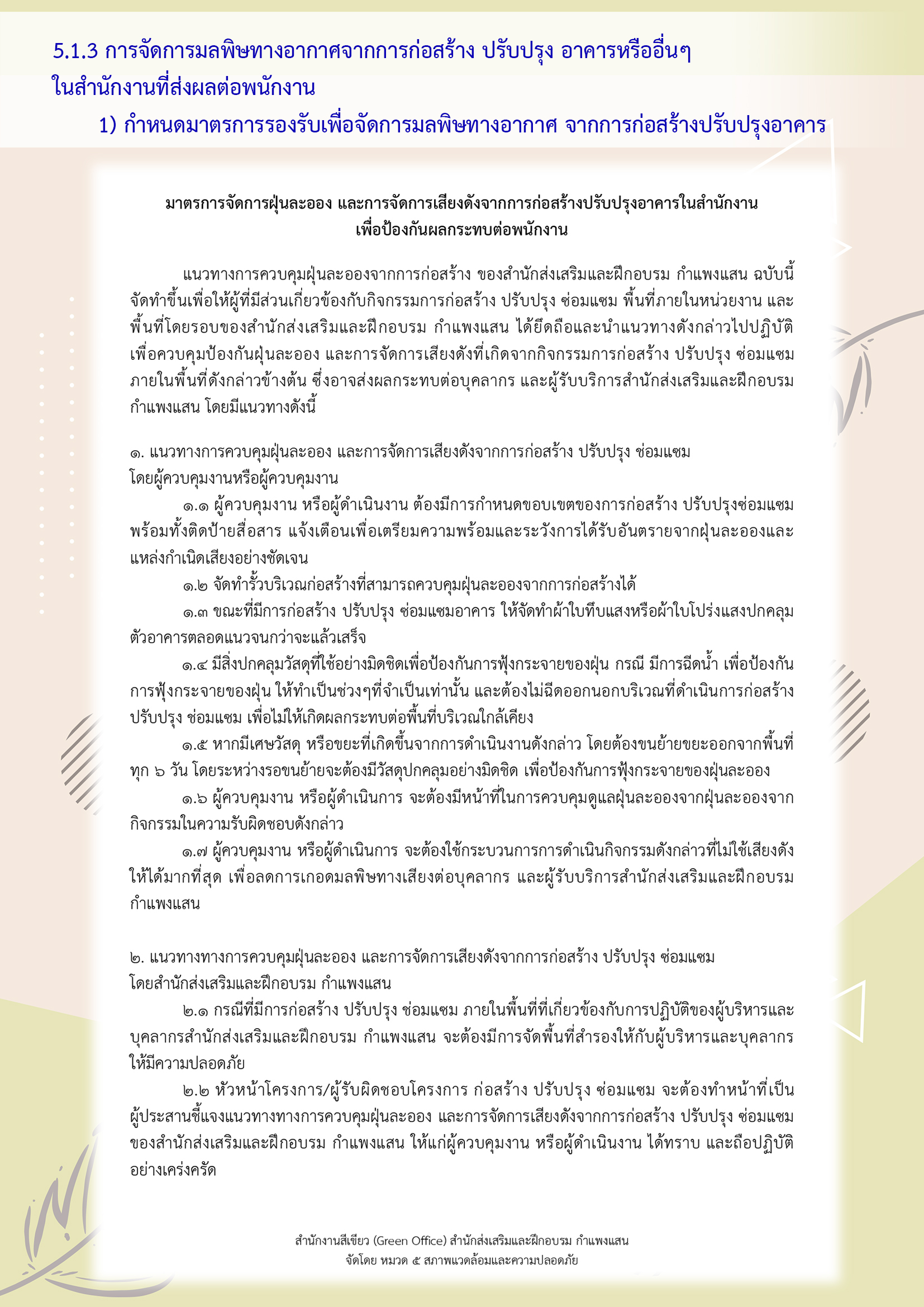 (1) กำหนดมาตรการรองรับเพื่อจัดการมลพิษทางอากาศจากการก่อสร้าง ปรับปรุงอาคาร