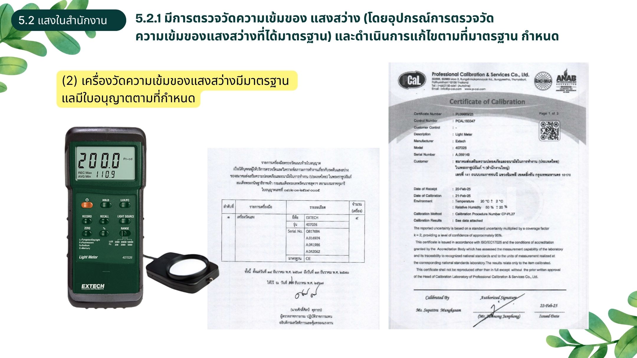 5.2.1 หลักฐานอ้างอิง (5) หลักฐานภาพประกอบการตรวจวัดความเข้มของแสงสว่างเฉพาะจุด ทำงานและพื้นที่ทำงาน