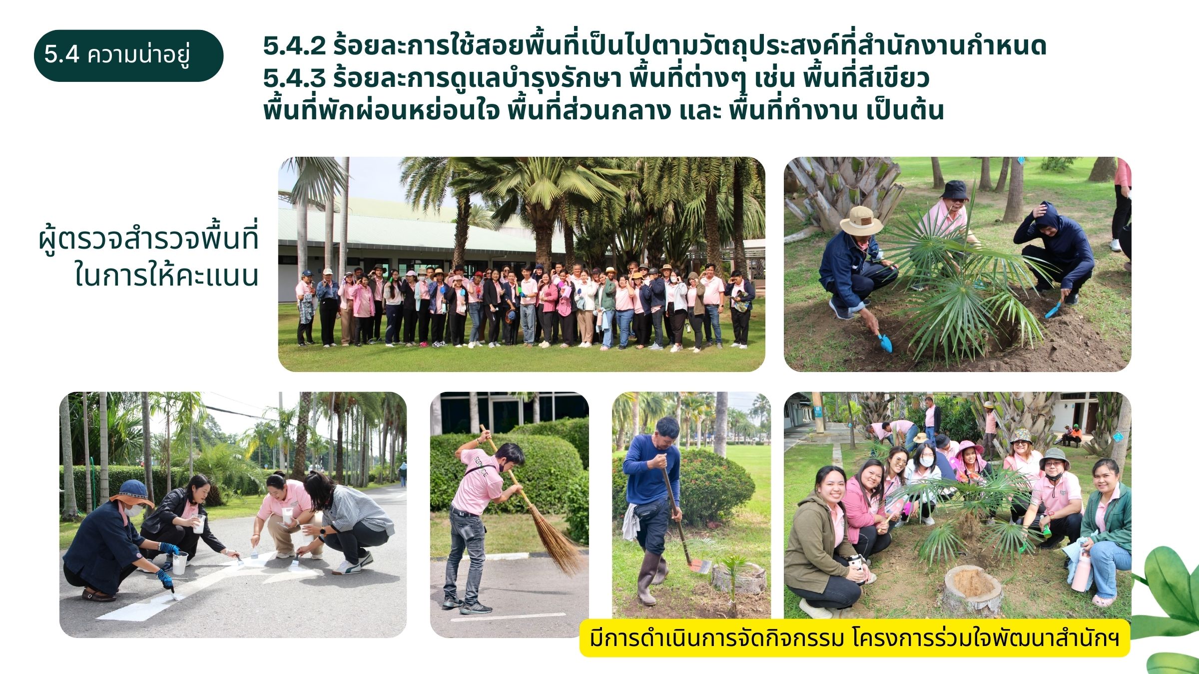 5.4.3 ร้อยละการดูแลบำรุงรักษาพื้นที่ต่างๆ เช่น พื้นที่สีเขียว พื้นที่พักผ่อนหย่อนใจ พื้นที่ส่วนกลาง และพื้นที่ทำงาน เป็นต้น
