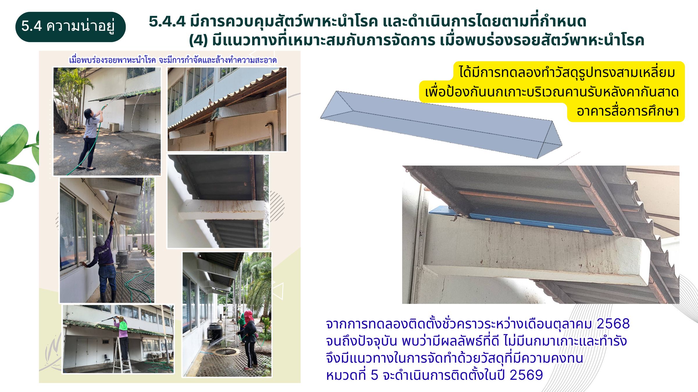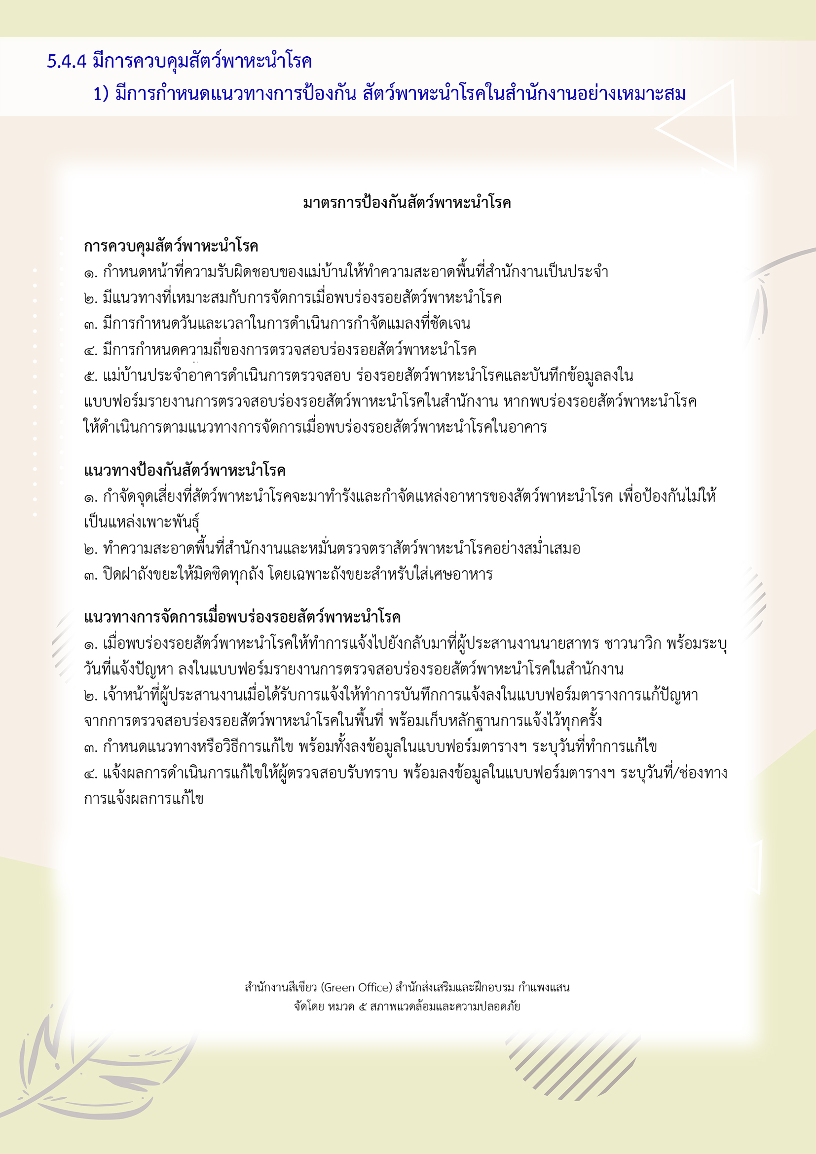 (1) มีการกำหนดแนวทางการป้องกันสัตว์พาหะนำโรคในสำนักงานอย่างเหมาะสม ได้แก่ นกพิราบ หนู แมลงสาบ และอื่นๆ
