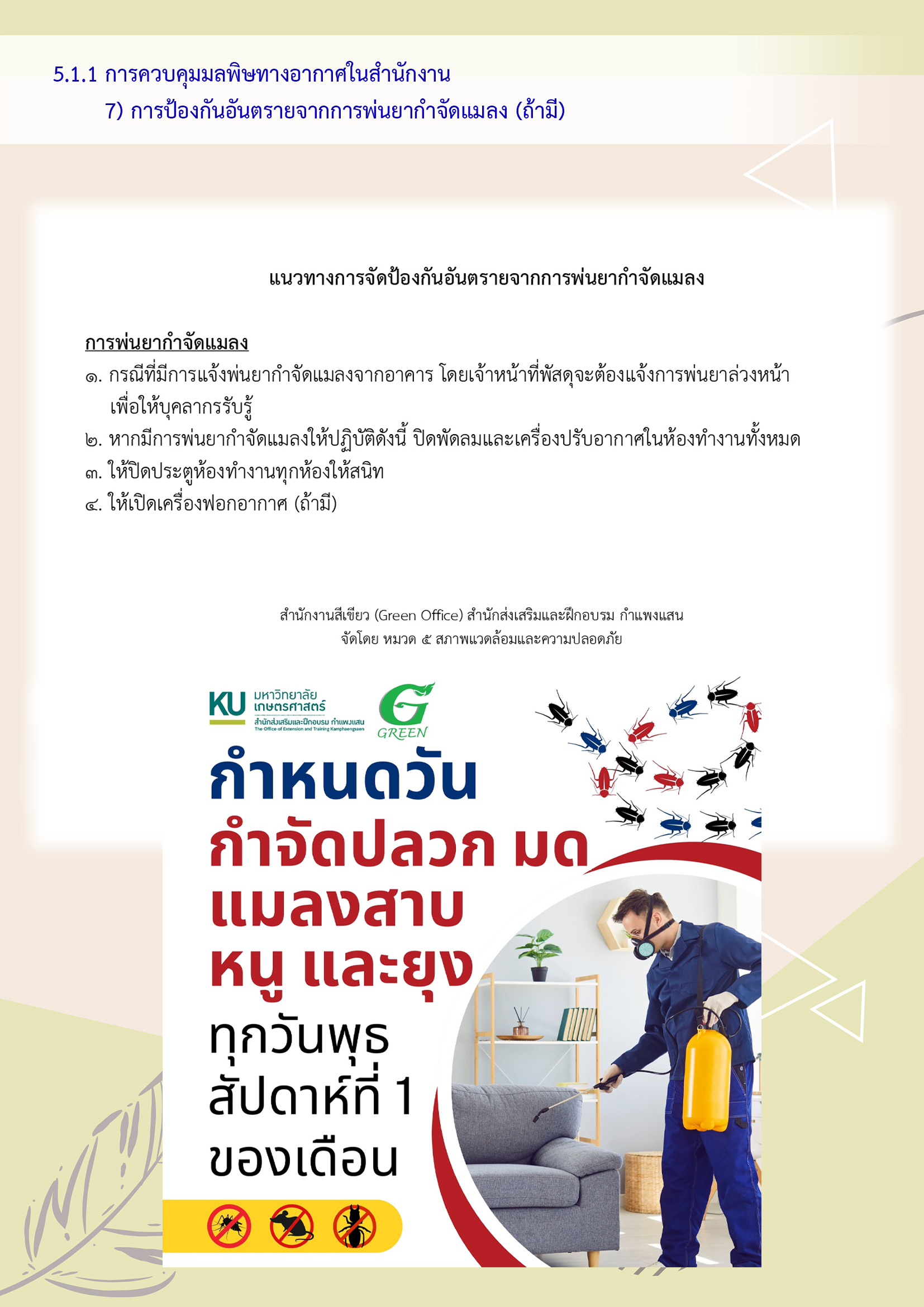 หมายเหตุ การควบคุมสัตว์พาหะนำโรค สำนักงานสามารถควบคุมและจัดการได้เอง หรือว่าจ้างหน่วยงานเฉพาะมาดำเนินการแทน