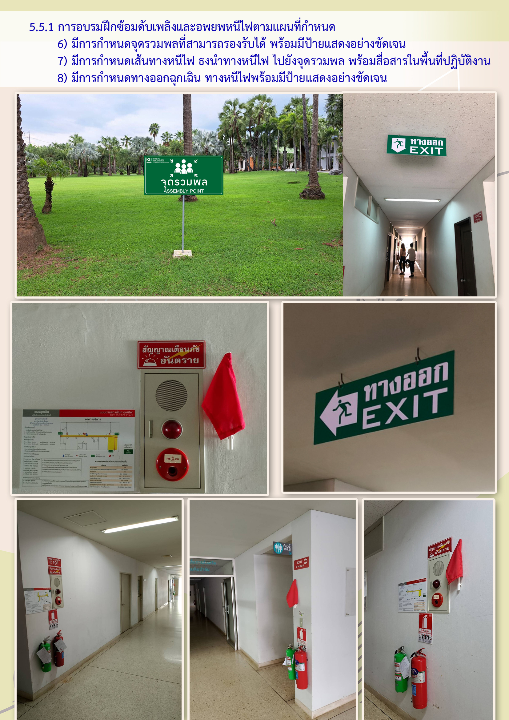 (7) มีการกำหนดเส้นทางหนีไฟ ธงนำทางหนีไฟ ไปยังจุดรวมพล พร้อมสื่อสารในพื้นที่ปฏิบัติงาน